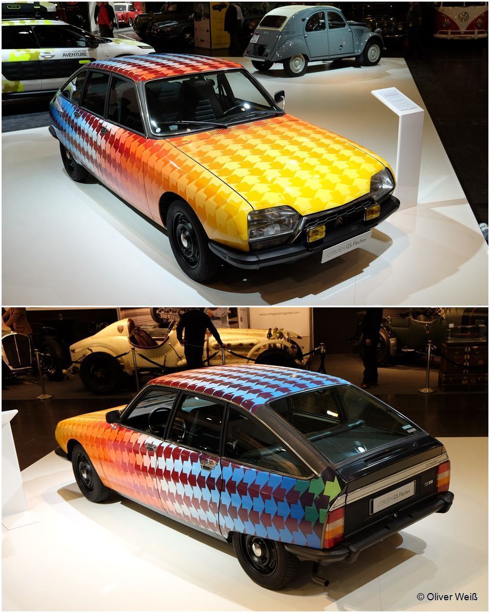 Stand von Citroen Deutschland: GS X2 von 1976 im Arrow-Design 73 verschiedene Farbtöne wurden benutzt um diesen GS künstlerisch zu gestalten. 4 Zylinder Boxer mit 1.220 ccm, 64 PS.